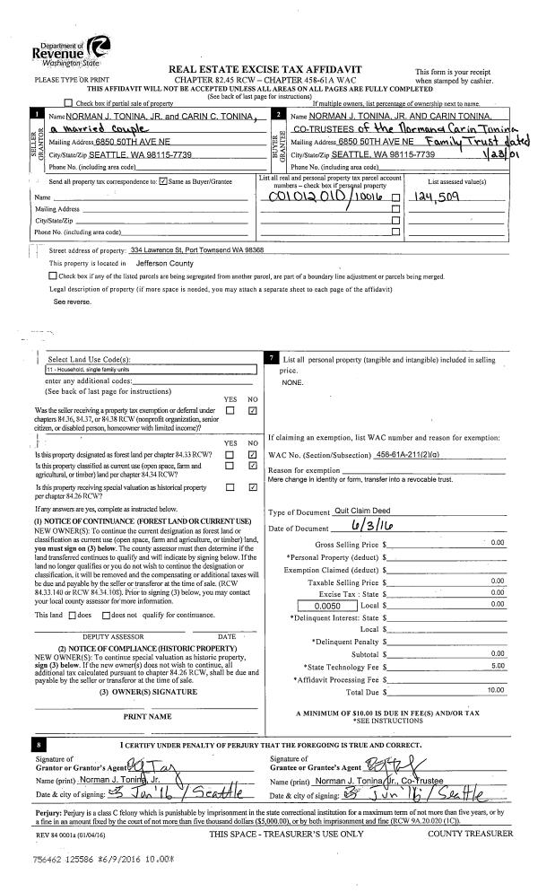 | Mailing Address: | NORMAN TONINA JR CARIN TONINA 334 LAWRENCE ST PORT TOWNSEND, WA 98368 | % Ownership: | 100.0000000000% |
