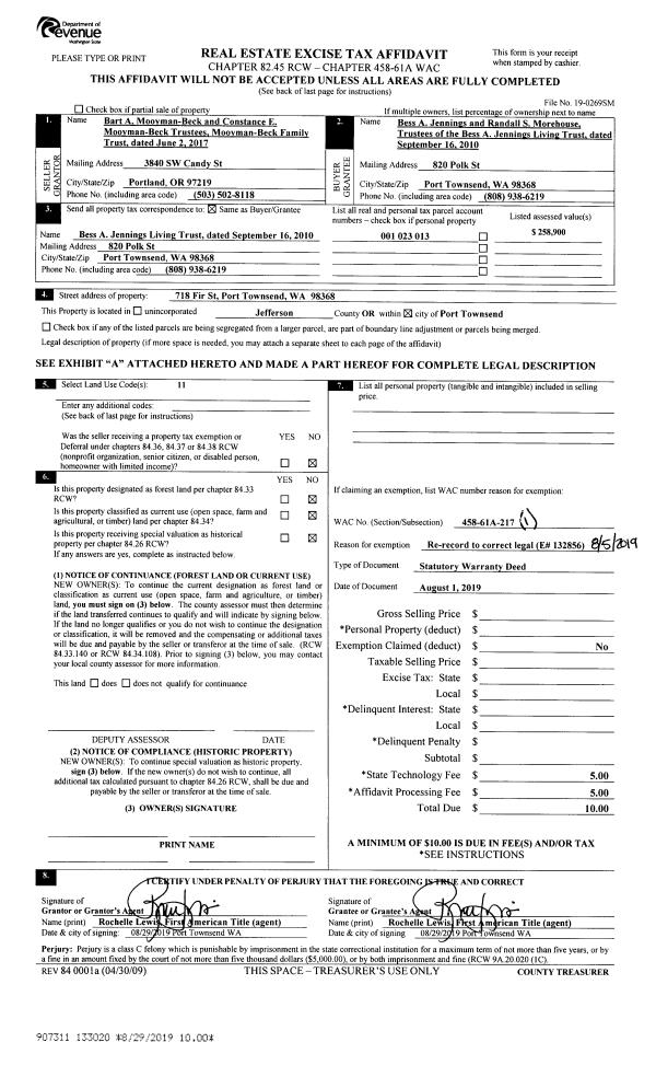 | 1 | 08/01/2019 | SWD | Statutory Warranty Deed | MOOYMAN BECK FAMILY TRUST | BESS JENNINGS LIVING TRUST | | | $387,000.00 | 132856 | |