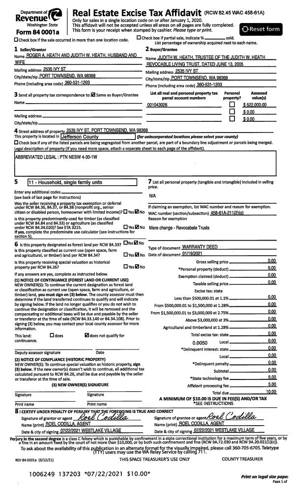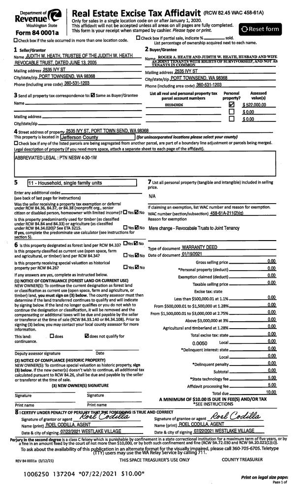 | 6 | 01/19/2021 | WD | Warranty Deed | REVOCABLE LIVING TRUST OF JUDITH W HEATH | ROGER & JUDITH HEATH JTWROS | | | | 137203 | |