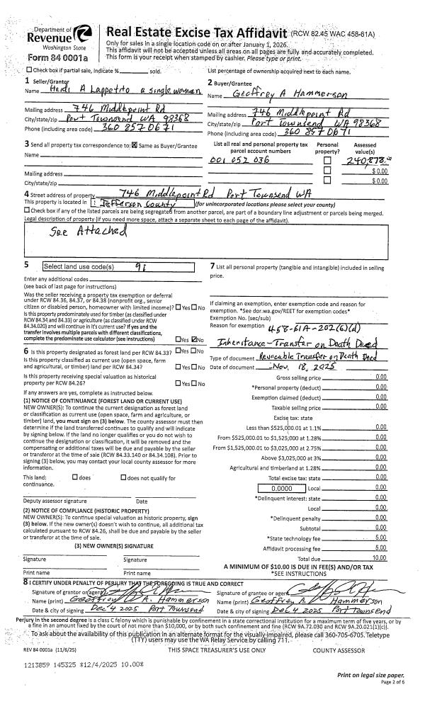 | 2 | 06/24/2016 | TODD | TRANSFER ON DTH DEED | HEIDI A LAPPETITO | GEOFFREY A HAMMERSON | | | | 0 | 600336 |
