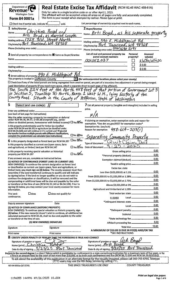 | 1 | 09/25/2025 | QCD | Quit Claim Deed | CHRISTINE & ARTI BOYD | ARTI BOYD | | | | 144996 | |