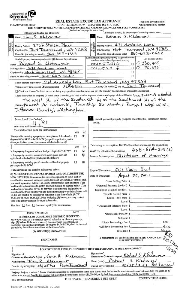 | 1 | 08/25/2021 | QCD | Quit Claim Deed | RICHARD S KLEBANOW | RICHARD S KLEBANOW | | | | 137542 | |