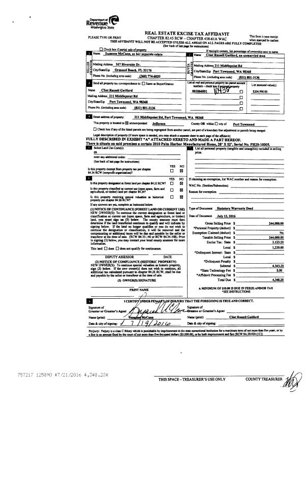 | 3 | 07/12/2016 | SWD | Statutory Warranty Deed | SUZANNE MCCANN | CLINT R GUILFORD | | | $244,000.00 | 125890 | |