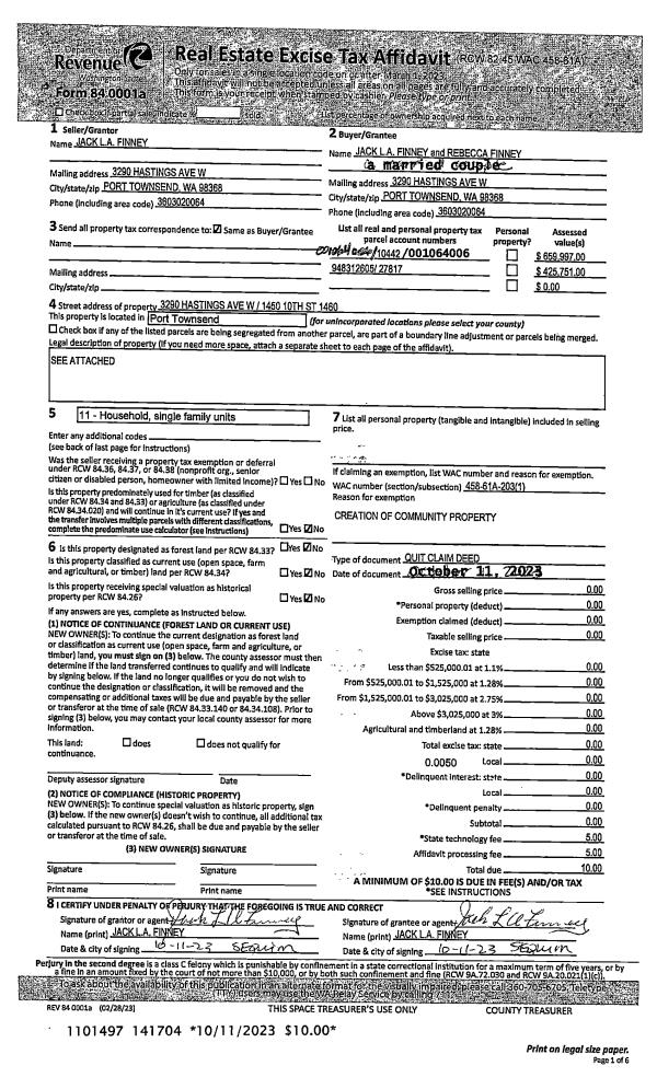 | 1 | 10/11/2023 | QCD | Quit Claim Deed | JACK L A FINNEY | JACK & REBECCA FINNEY | | | | 141704 | |