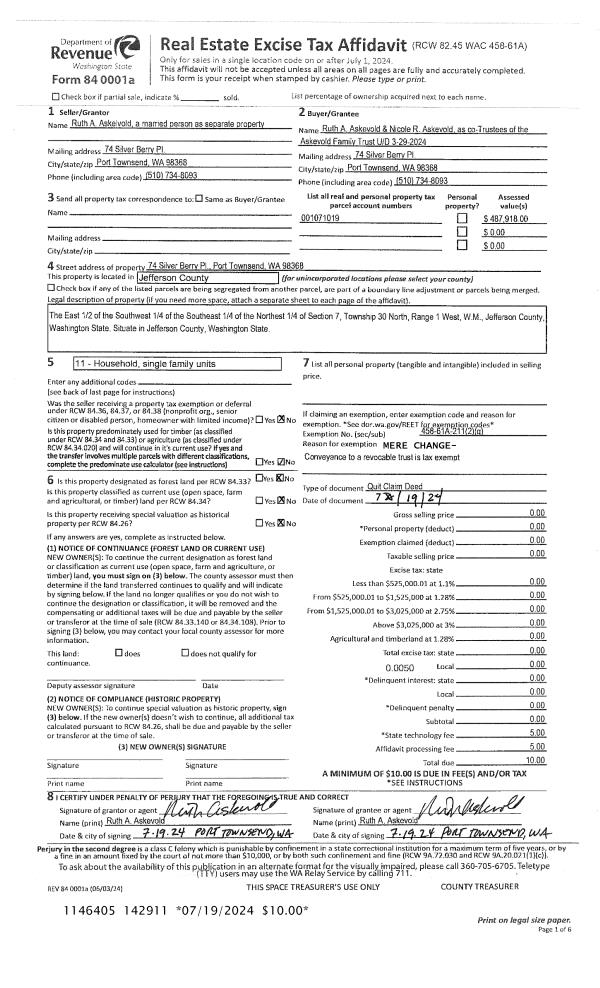 | 1 | 07/19/2024 | QCD | Quit Claim Deed | RUTH A ASKEVOLD | ASKEVOLD FAMILY TRUST | | | | 142911 | |