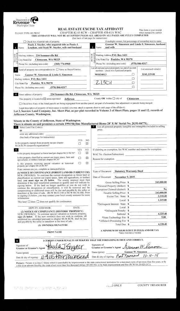 | 2 | 02/09/2022 | SWD | Statutory Warranty Deed | CLARENCE LAMMERS LIVING TRUST | JASCHA GULDEN & MEGAN FOLEY | | | $140,000.00 | 138537 | |