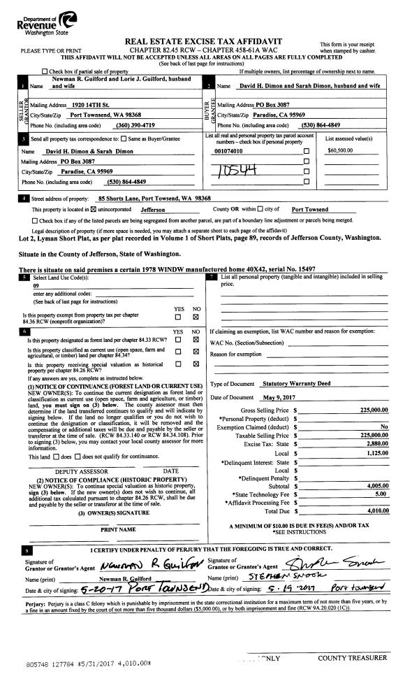 | 3 | 05/09/2017 | SWD | Statutory Warranty Deed | NEWMAN R GUILFORD | DAVID H & SARAH DIMON | | | $225,000.00 | 127784 | |