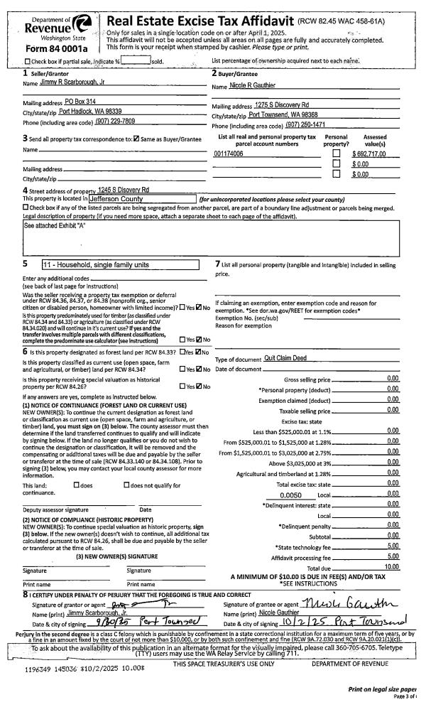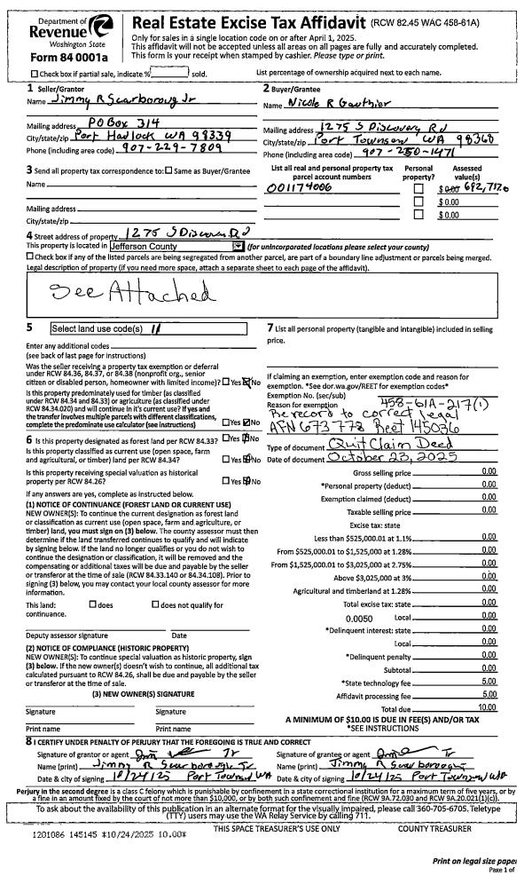 | 1 | 10/02/2025 | QCD | Quit Claim Deed | JIMMY SCARBOROUGH JR & NICOLE GAUTHIER | NICOLE R GAUTHIER | | | | 145036 | |