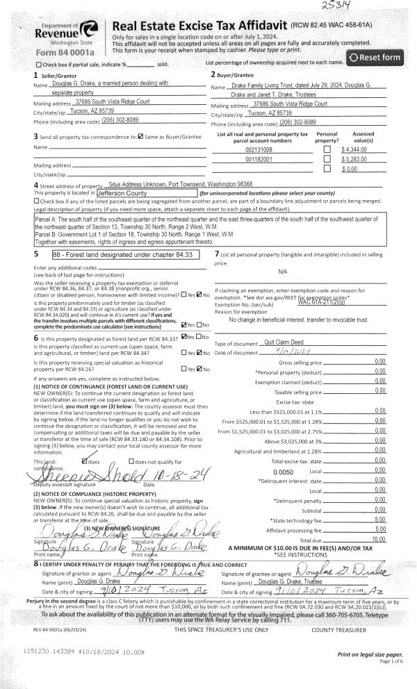 | 1 | 09/10/2024 | QCD | Quit Claim Deed | | DRAKE FAMILY TRUST | | | | 143389 | |