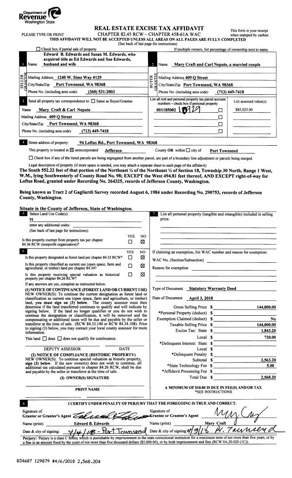 | 2 | 04/03/2018 | SWD | Statutory Warranty Deed | EDWARD B & SUSAN M EDWARDS | MARY CRAFT & CARL NEPUTE | | | $144,000.00 | 129879 | |