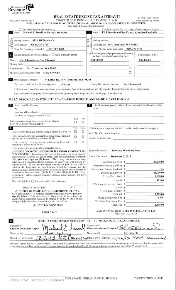 | 3 | 12/03/2013 | SWD | Statutory Warranty Deed | MICHAEL E JEWELL | EDWARD B & SUSAN M EDWARDS | | | $85,000.00 | 120431 | |