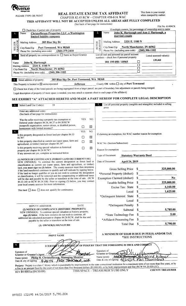 | 2 | 04/24/2019 | SWD | Statutory Warranty Deed | CHRISTOFFERSEN PROPERTIES LLC | JOHN K & ANN J HARTSOUGH | | | $325,000.00 | 132195 | |
