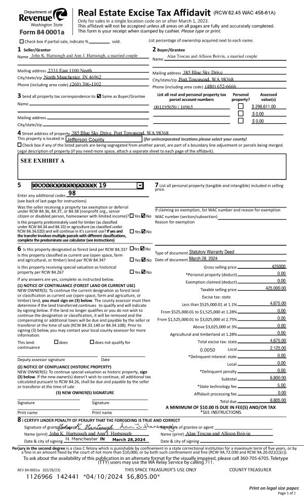 | 1 | 03/28/2024 | SWD | Statutory Warranty Deed | JOHN K & ANN J HARTSOUGH | ALAN TOSCAN | | | $425,000.00 | 142441 | |