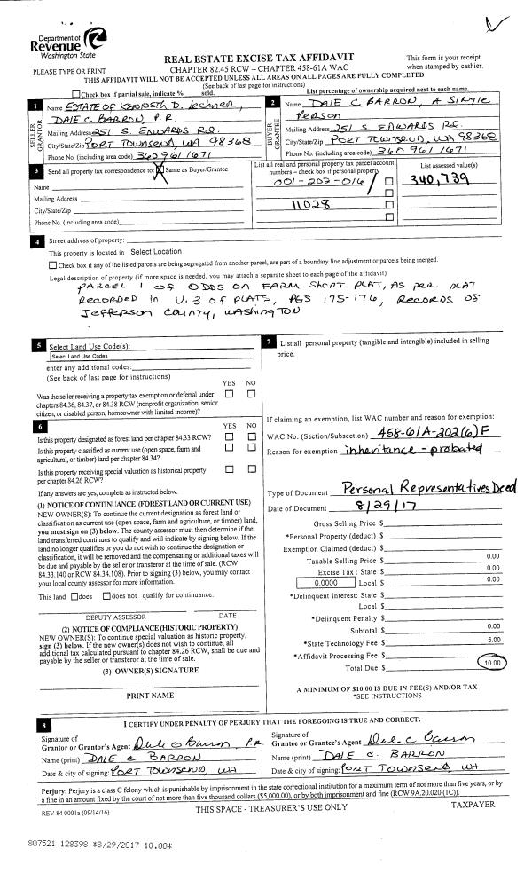 | 2 | 08/29/2017 | PRD | Personal Representatives Deed | KENNETH D LECHNER | DALE C BARRON | | | | 128398 | |