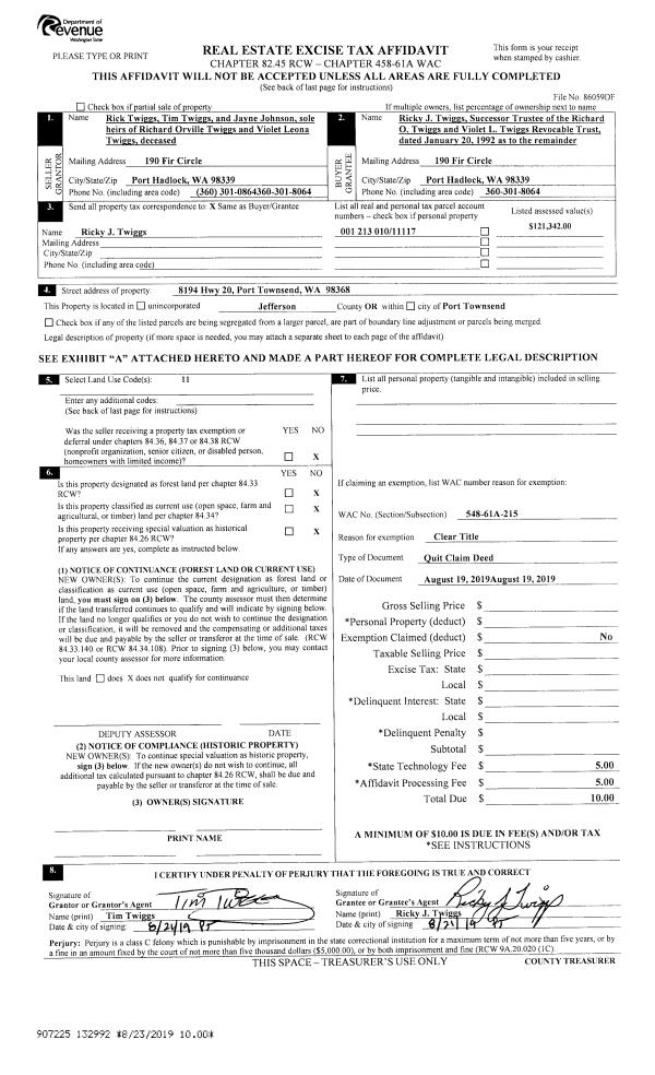 | 1 | 08/19/2019 | SWD | Statutory Warranty Deed | RICHARD O TWIGGS TRTEE | SUNIE RAE WISE | | | $150,000.00 | 132993 | |