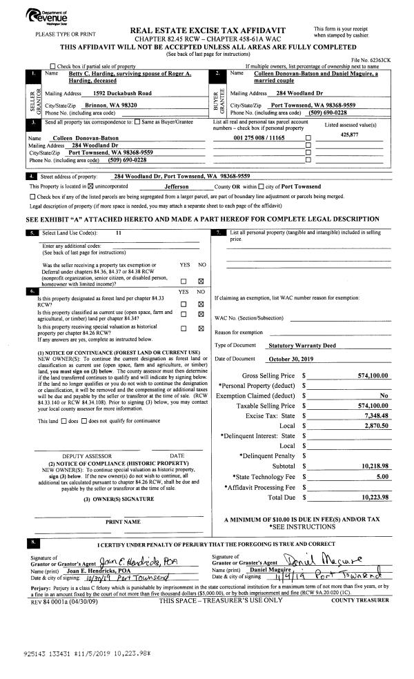 | 4 | 10/30/2019 | SWD | Statutory Warranty Deed | BETTY C HARDING | COLLEEN DONOVAN BATSON & DANIEL MAGUIRE JTWROS | | | $574,100.00 | 133431 | |