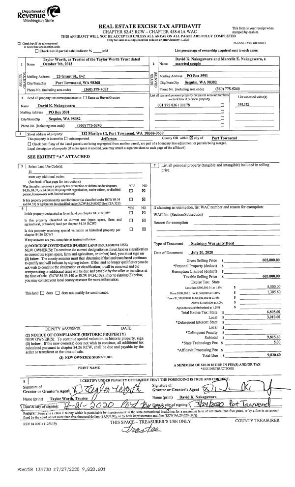 | 1 | 07/20/2020 | SWD | Statutory Warranty Deed | TAYLOR WORTH TRUST | DAVID K & MARCELLE E NAKAGAWARA | | | $602,000.00 | 134730 | |