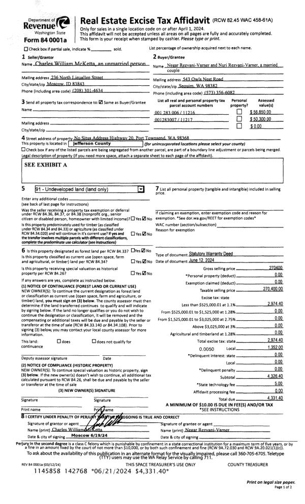 | 2 | 06/12/2024 | SWD | Statutory Warranty Deed | CHARLES W MC KETTA | NEGAR & NURI REZVANI-VARNER | | | $270,400.00 | 142768 | |