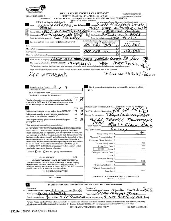 | 4 | 09/01/2017 | QCD | Quit Claim Deed | GLENDA MCDONALD | GLENDA MCDONALD LIVING TRUST | | | | 130152 | SEE #141698 |