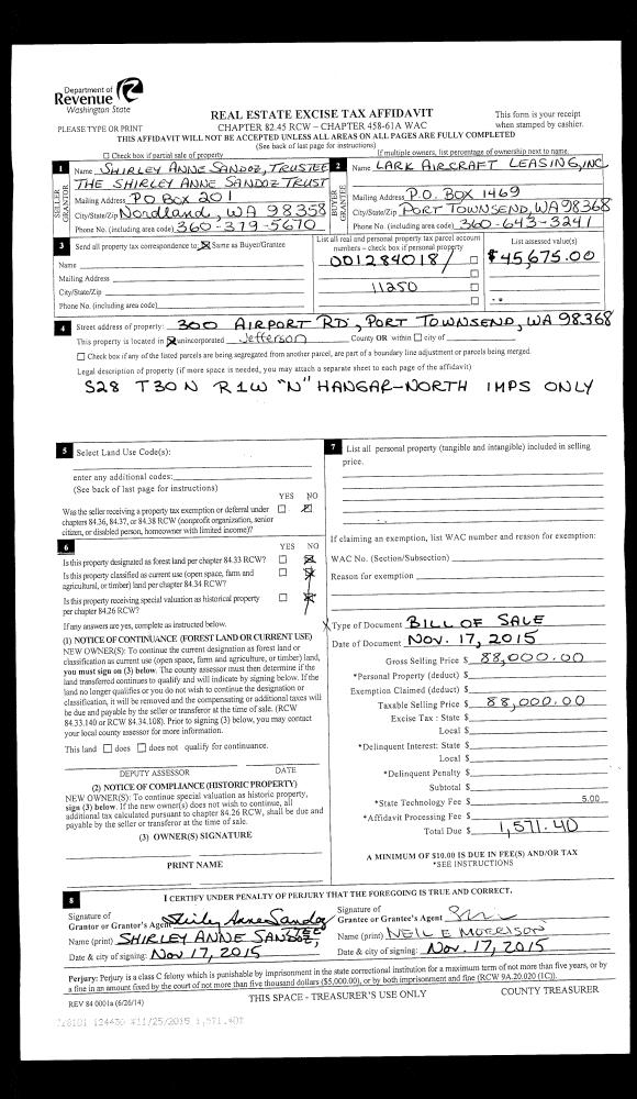 | 1 | 11/17/2015 | BOS | Bill Of Sale | SHIRLEY A SANDOZ TRUSTEE | LARK AIRCRAFT LEASING INC | | | $88,000.00 | 124430 | |
