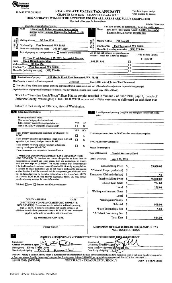 | 2 | 05/02/2013 | SPWD | Special Warranty Deed | QUIMPER COMMUNITY FEDERAL | 691 TREE TRUST | | | $55,000.00 | 119213 | |
