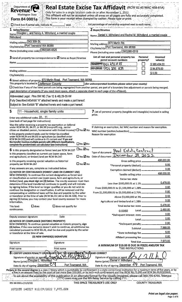 | 1 | 12/29/2022 | REC | Real Estate Contract | DOUGLAS L MILHOLLAND | DANIEL V & RACHEL M MILHOLLAND | | | $498,000.00 | 140327 | |