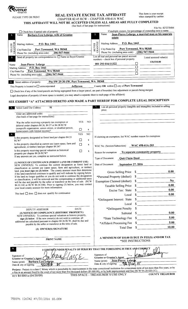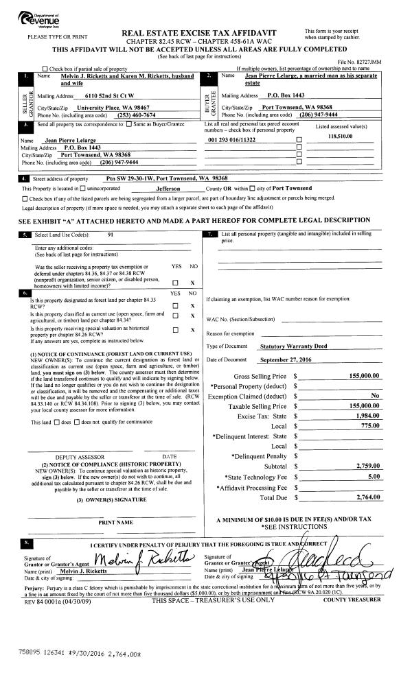 | 1 | 09/27/2016 | SWD | Statutory Warranty Deed | MELVIN J RICKETTS | JEAN PIERRE LELARGE | | | $155,000.00 | 126341 | |