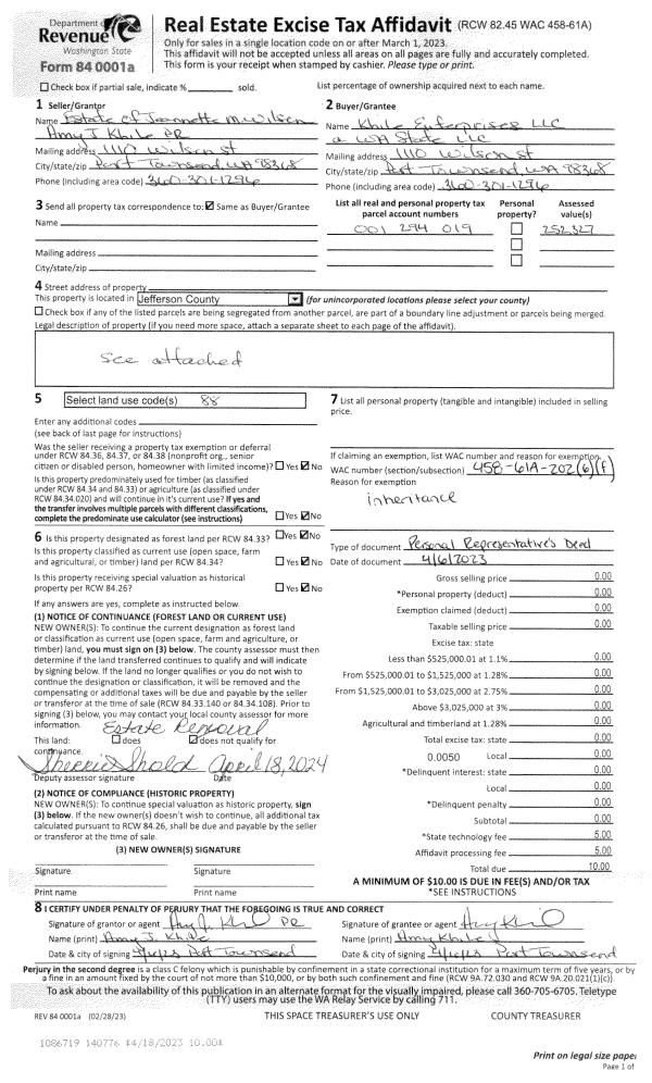 | 1 | 04/06/2023 | PRD | Personal Representatives Deed | JEANNETTE M WILSON | KHILE ENTERPRISES, LLC | | | | 140776 | |