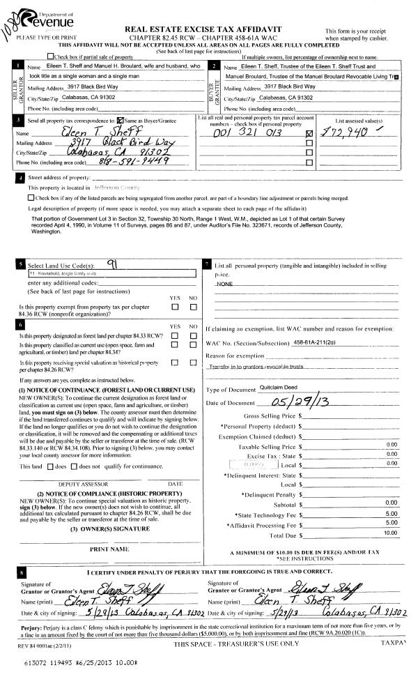 | 2 | 05/29/2013 | QCD | Quit Claim Deed | R | E SHEFF TRUST/M BROULARD REV LIV TRUST | | | | 119493 | |