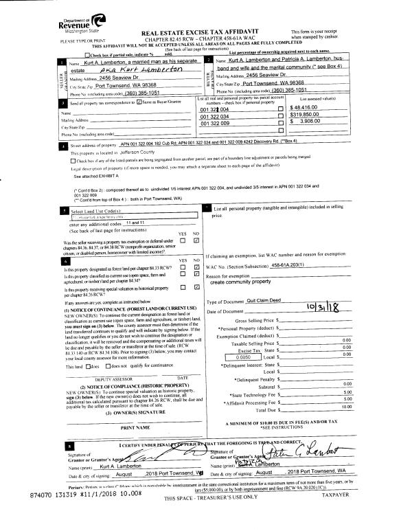 | Mailing Address: | KA & PA LAMBERTON / LJ BROWN W & B TWEEDIE 4242 S DISCOVERY RD PORT TOWNSEND, WA 98368 | % Ownership: | 100.0000000000% |
