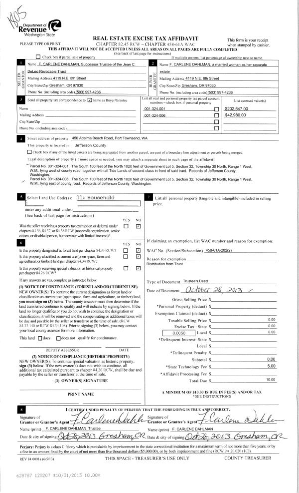 | 2 | 10/28/2013 | TRED | Trustee Deed | JEAN DE LEO REVOCABLE TRUST | F CARLENE DAHLMAN | | | | 120207 | |