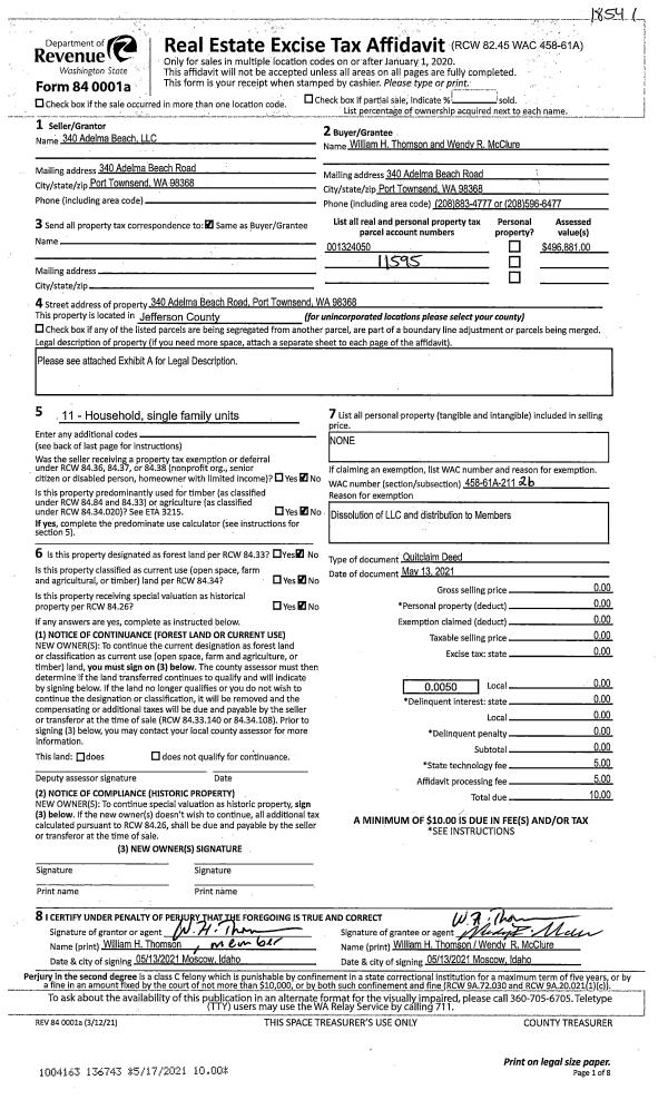 | 1 | 05/13/2021 | QCD | Quit Claim Deed | 340 ADELMA BEACH LLC | WILLIAM H THOMSON | | | | 136743 | |