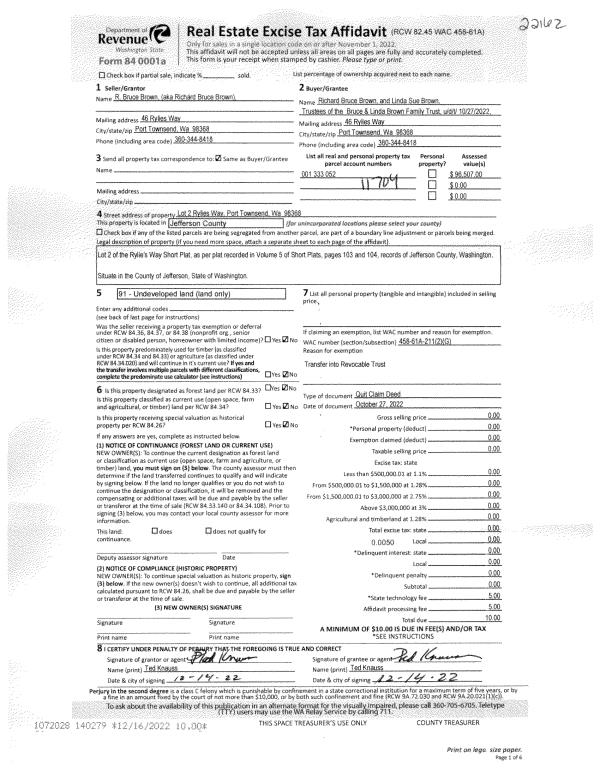 | 1 | 10/27/2022 | QCD | Quit Claim Deed | | BRUCE & LINDA BROWN FAMILY TRUST | | | | 140279 | |