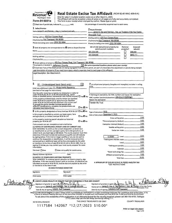 | Mailing Address: | JAMES B & PATRICIA L HAY TRUSTEES 925 FOUR CORNERS RD PORT TOWNSEND, WA 98368-9373 | % Ownership: | 100.0000000000% |