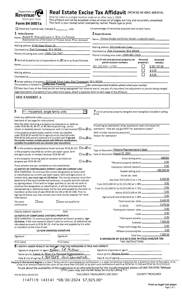 | 1 | 08/22/2024 | PRD | Personal Representatives Deed | THOMAS J WISE | SHENOA & KAILEY SNYDER | | | $495,000.00 | 143141 | |