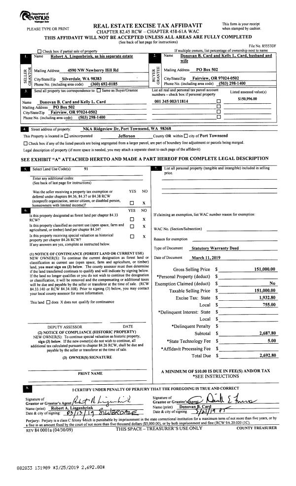 | 1 | 03/11/2019 | SWD | Statutory Warranty Deed | ROBERT A LINGENBRINK | DONOVAN B & KELLY L CARD | | | $151,000.00 | 131989 | |