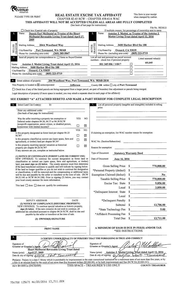 | 1 | 06/16/2016 | SWD | Statutory Warranty Deed | DENNIS E MC DANIEL TRSTE | ANTOINE MOTTET LIVING TRUST | | | $770,000.00 | 125671 | |