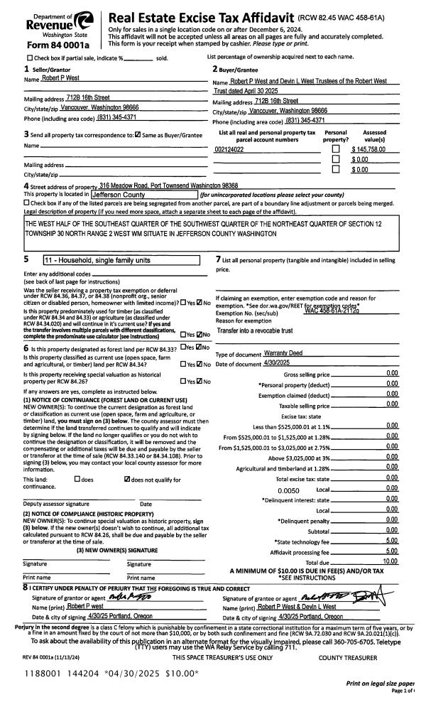 | 1 | 04/30/2025 | WD | Warranty Deed | ROBERT P WEST | ROBERT WEST TRUST | | | | 144204 | |