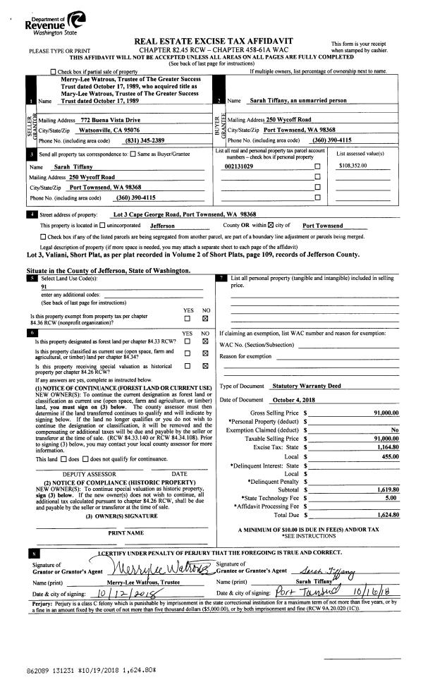 | 1 | 10/04/2018 | SWD | Statutory Warranty Deed | MARY LEE WATROUS TRUSTEE | SARAH TIFFANY | | | $91,000.00 | 131231 | |