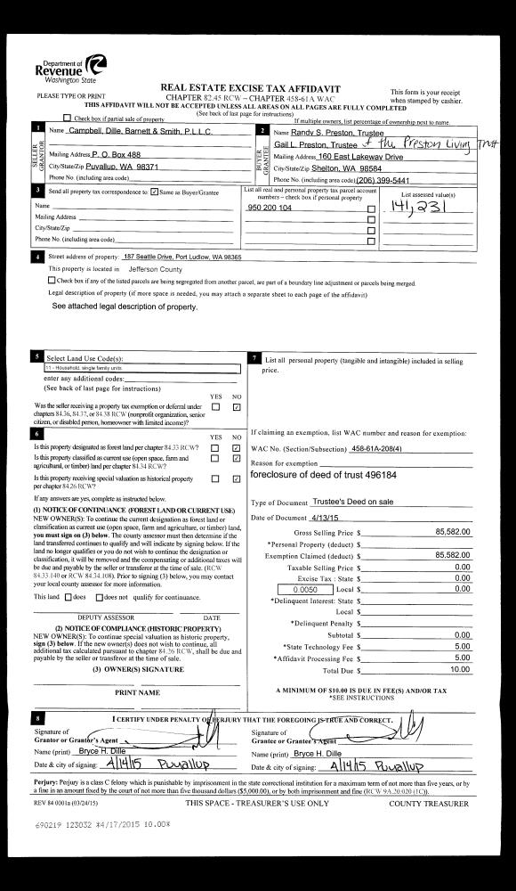 | Mailing Address: | JAMES H & LYNNE E DEWITT TRUSTEES 1240 W SIMS WAY #14 PORT TOWNSEND, WA 98368 | % Ownership: | 100.0000000000% |