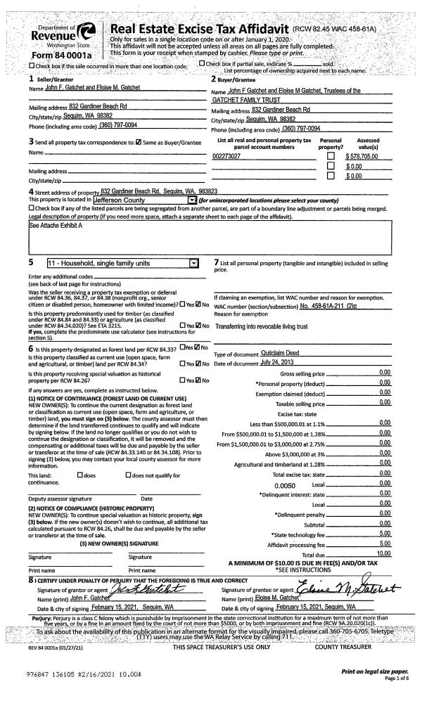 | Mailing Address: | JOHN F GATCHET TRUSTEE ELOISE M GATCHET TRUSTEE 832 GARDINER BEACH RD SEQUIM, WA 98382-8751 | % Ownership: | 100.0000000000% |