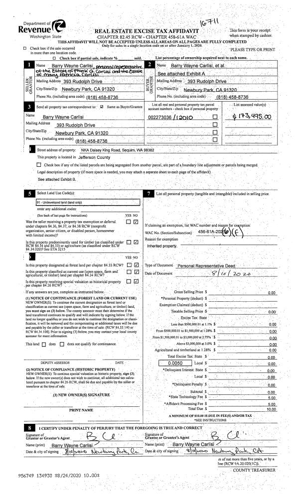 | 2 | 08/10/2020 | PRD | Personal Representatives Deed | FRANK G CARLISI | BARRY W CARLISI | | | | 134930 | |