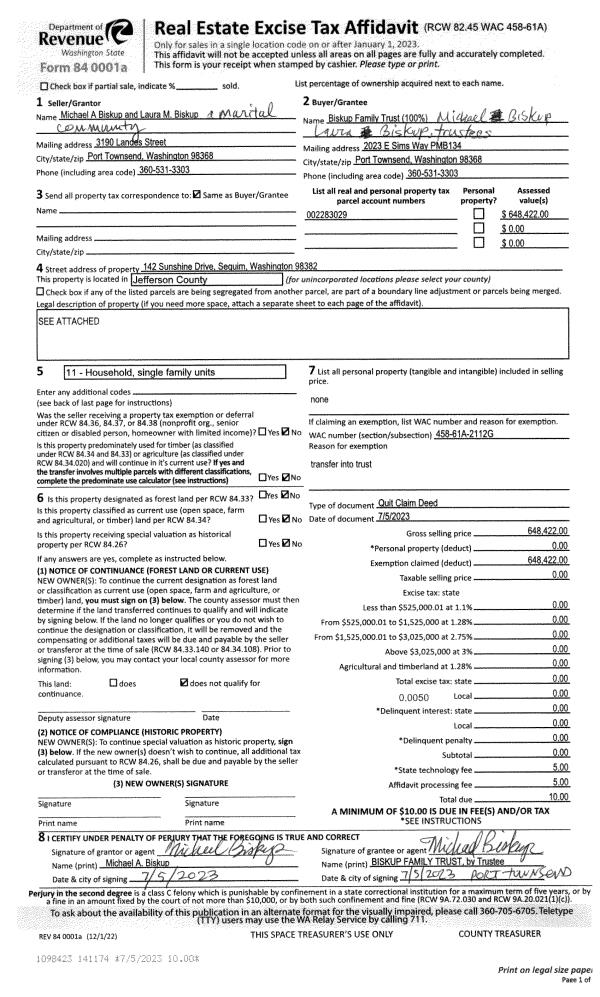 | 2 | 07/05/2023 | QCD | Quit Claim Deed | MICHAEL A & LAURA M BISKUP | BISKUP FAMILY TRUST | | | | 141174 | |