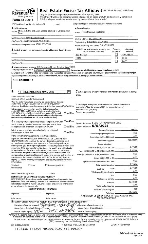| 1 | 05/05/2025 | SWD | Statutory Warranty Deed | BISKUP FAMILY TRUST | FRANK NUGENT | | | $755,000.00 | 144254 | |