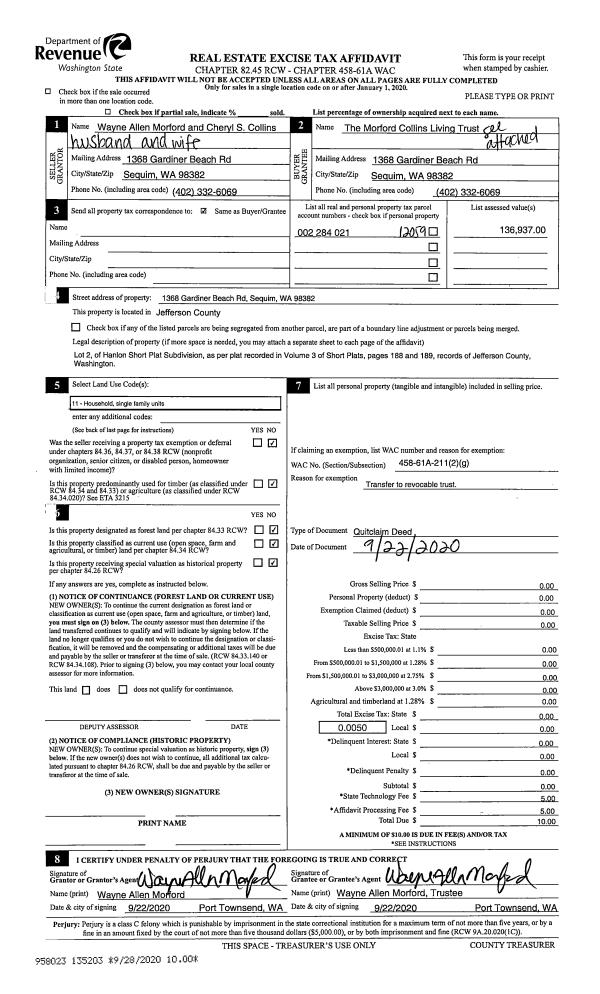 | 1 | 09/22/2020 | QCD | Quit Claim Deed | WAYNE A MORFORD | MORFORD COLLINS LIVING TRUST | | | | 135203 | |