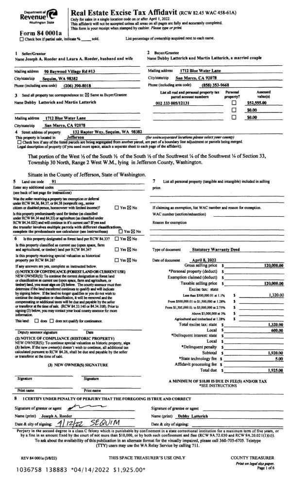 | 1 | 04/08/2022 | SWD | Statutory Warranty Deed | JOSEPH & LAURA ROEDER | DEBBY & MARTIN LATTERICH | | | $120,000.00 | 138883 | |