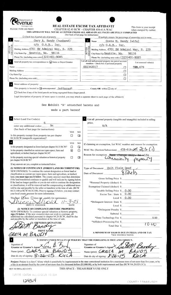 | 4 | 08/26/2015 | QCD | Quit Claim Deed | GARY A BANDY | GRETA M BANDY | | | | 124304 | |