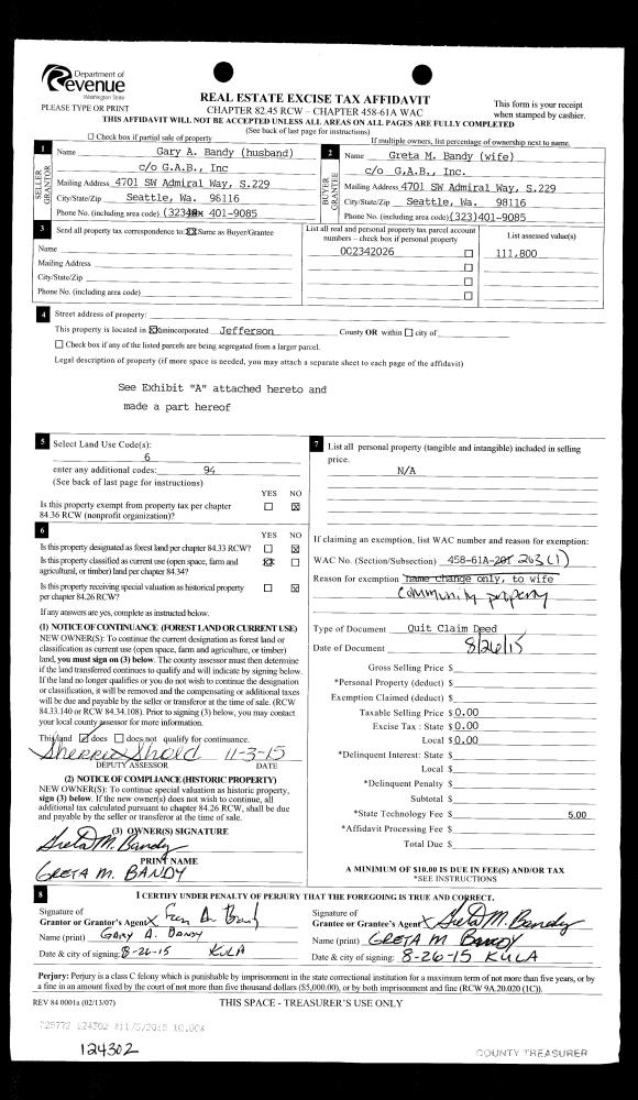 | 3 | 08/26/2015 | QCD | Quit Claim Deed | GARY A BANDY | GRETA M BANDY | | | | 124302 | |