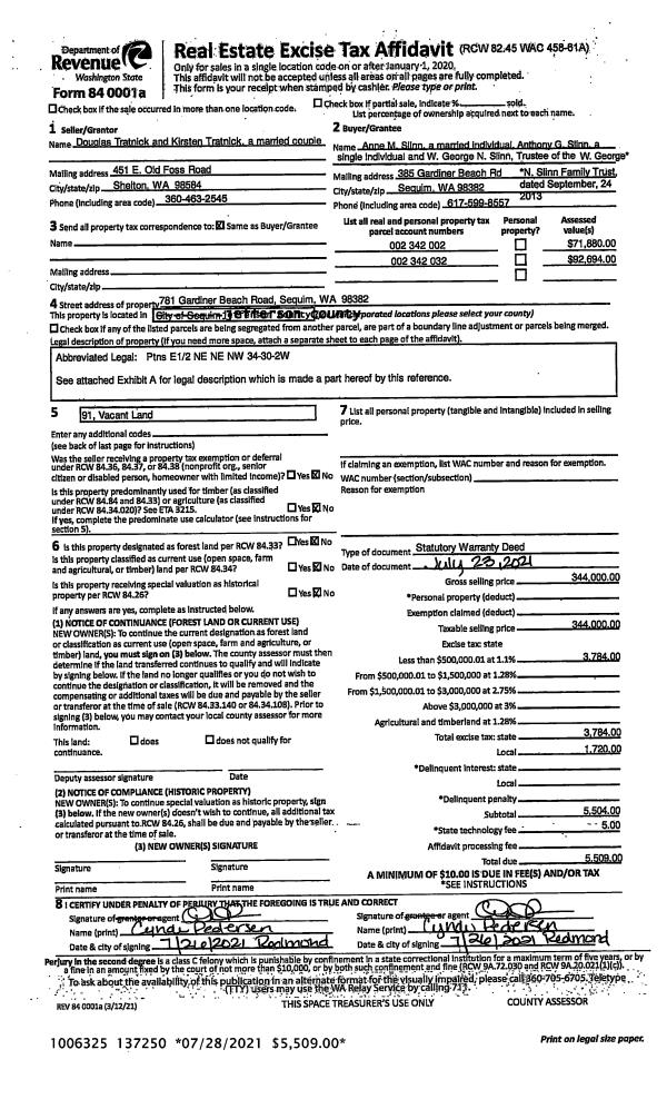 | 2 | 07/23/2021 | SWD | Statutory Warranty Deed | KIRSTEN TRATNICK | ANNE M SLINN | | | $344,000.00 | 137250 | |