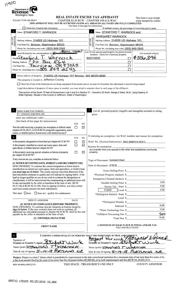 | 2 | 04/18/2018 | QCD | Quit Claim Deed | STANFORD T WARNOCK | STANFORD T & MARGARET WARNOCK | | | | 130203 | |